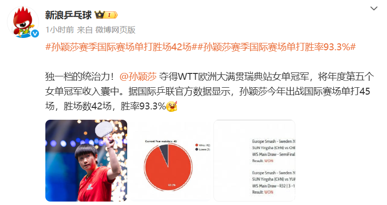 更重要的是,据国际乒联官方数据显示,孙颖莎今年出战国际赛场单打45场,胜场数42场,胜率93.3%!这绝对是独一档的统治力