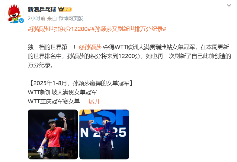随着瑞典大满贯夺冠,孙颖莎的世界排名积分达到12200分,再创历史新高,这一数字令人惊叹,因为它甚至超过了许多国家顶尖选手积分之和,根据博主乒乓Rankings的报道,第35周世排积分变化中,孙颖莎因瑞典大满贯夺冠增加1650分,总积分来到12200分,王曼昱则获得1135分升至7900分,继续排名世界第二;值得一提的是,这已经不是孙颖莎第一次刷新积分纪录,在2025年5月27日公布的世界排名中,她就已经以11900分创造了国际乒联世界排名积分纪录